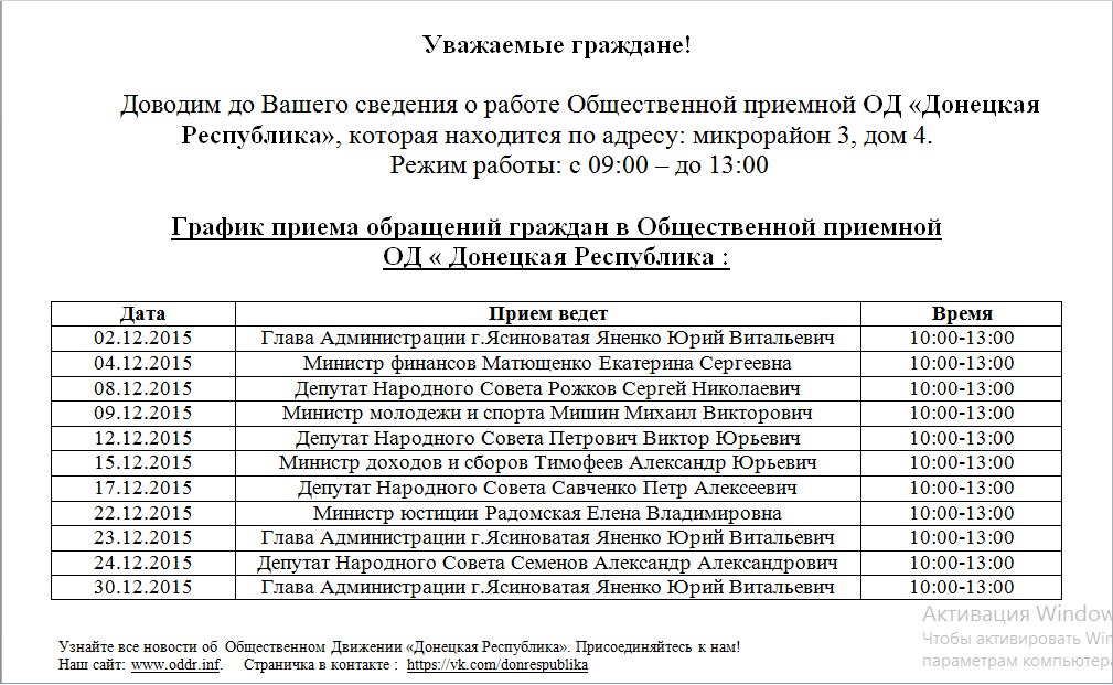 График приема обращений граждан в Общественной приемной ОД «Донецкая Республика»: